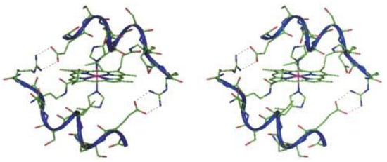 - Lombardi, A.; Nastri, F.; Marasco, D.; Maglio, O.; De Sanctis, G.; Sinibaldi, F.; Santucci, R.; Coletta, M.; Pavone, V. Design of a New Mimochrome with Unique Topology. Chem. Eur. J. 2003, 9, 5643–5654. [Google Scholar] [CrossRef] [PubMed]