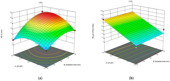 Figure 1 shows the response surfaces for the concentration (Figure 1a) and purity (Figure 1b) of C-PE. In the case of the concentration of C-PE, longer times and lower pH significantly improve the final content of C-PE; however, on the purity of the extract, there is no curvature, and only the pH increases the result, while the time does not affect the outcome. It should be noted that the purity index obtained is higher than 0.7, which is considered food-grade.