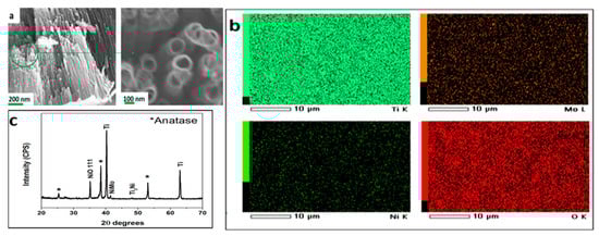 Characterization of Ti-Mo-Ni-O NTs formed by breakdown anodization. (a) SEM image; (b) EDX mapping showing the chemical elements Ti, Mo, Ni, and O; and (c) XRD spectra.