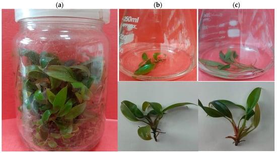 The Philodendron “Imperial Red” (Philodendron erubescens) shoots were purchased from the Agronomy Research Institute, Agricultural Research Center (ARC), Giza, Egypt. P. erubescens shoots were started and maintained on MS [24] solid medium that included 0.5 mg/L of BA and Kinetin, 3% sucrose, and 8.0 g/L agar with pH of 5.7. Regenerated shoots were subculture once every 4 weeks on MS medium without plant growth regulators and used as plant materials to conduct this experiment.