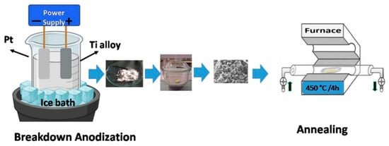 The nanotube powder was prepared from Ti-0.3Mo-0.8Ni sheets via breakdown anodization [23]. The metal sheets were cleaned in acetone, ethanol, and deionized water in an ultrasonic cleaner for 15 min, sequentially. The anodization setup was made of a Ti-0.3Mo-0.8Ni sheet as a working electrode and graphite rod as a counter electrode dipped into 0.1 M of perchloric acid electrolyte solution at 0 °C and connected to a DC power supply at 13 V. The process stopped when the Ti-0.3Mo-0.8Ni sheet was transformed completely into fine white nanotube powder. The electrolyte solution was filtered to collect the powder, which was then washed thoroughly with deionized water and dried overnight. The nanotube powder was annealed in air at 450 °C for 4 h with a heating rate of 5 °C/min. Scheme 1 shows the preparation steps to obtain the Ti-Mo-Ni oxide NTs powder. The morphology and the elements present in the powder were examined by Zeiss FESEM Ultra 60 microscope and an Energy Dispersive X-ray (EDX) unit attached to the Zeiss microscope. The crystalline structure was analyzed using a X’Pert PRO MRD diffractometer (Cu source at a scan rate (2°) of 0.05° s−1).