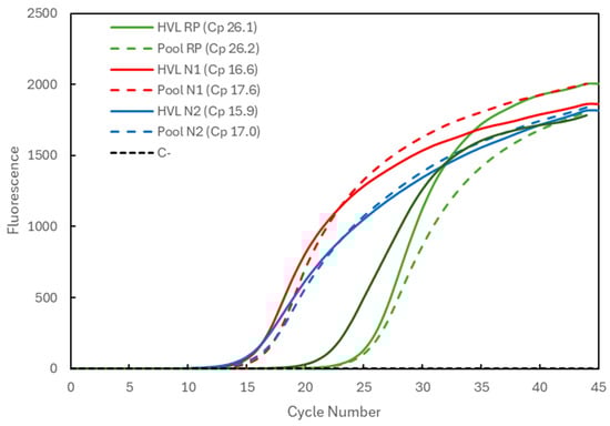 In Figure 1, the Cp comparison is presented for a sample with high viral load (HVL). When analyzed individually (full lines), the Cp values were 26.1 for the RP gene (green) and 16.6 and 15.9 for the N1 and N2 targets (red and blue), respectively, of the SARS-CoV-2 virus. When pooled with two other negative samples, the Cp values (dashed lines) remained constant for the RP gene (26.2) and increased to 17.6 and 17.0 for the N1 and N2 targets, respectively. The average Cp value for the RP gene at IPS COVID Lab was determined to be 26.69 ± 1.03 (n = 4935).