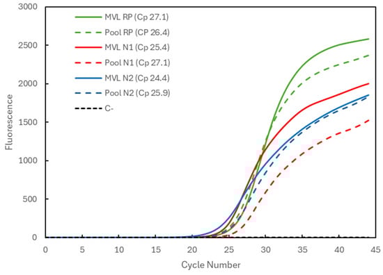 Comparison of Cp values for a medium-viral-load (MVL) positive sample analyzed individually (solid lines correspond to MVL + target) and in a 3-sample pool (dashed lines correspond to Pool + target). The 3 genetic targets were the RP human gene (green) and the viral N1 (blue) and N2 (red) targets. For each reaction, the Cp value is presented. The dashed black line (C−) represents the negative control reaction induced for each target, illustrative of all three.