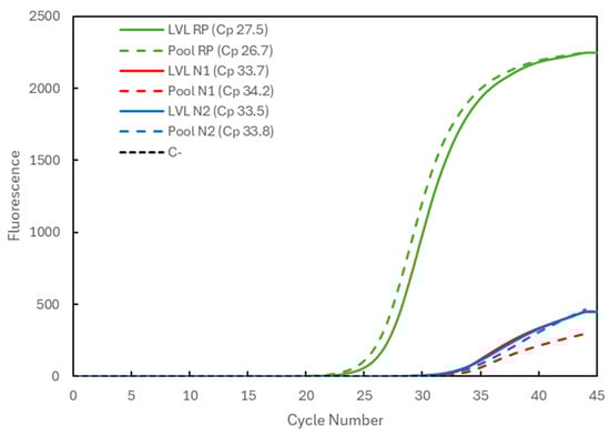 Comparison of the Cp values for a very-low-viral-load (LVL) positive sample analyzed individually (solid lines correspond to LVL + target) and in a 3-sample pool (dashed lines correspond to Pool + target). The 3 genetic targets were the RP human gene (green) and viral N1 (blue) and N2 (red) targets. For each reaction, the Cp value is presented. The dashed black line (C−) represents the negative control reaction induced for each target, illustrative of all three.