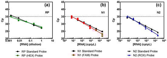 Assessment of the probes for the multiplex procedure versus the FAM-labelled probes of the standard procedure for each genomic target: RP (a), N1 (b), and N2 (c). Pure SARS-CoV-2 RNA (N1 and N2 targets) at 2000 copies per microliter (cp/μL) and swab-derived human RNA (RP target), with an estimated initial value of 1, were successively diluted in water.