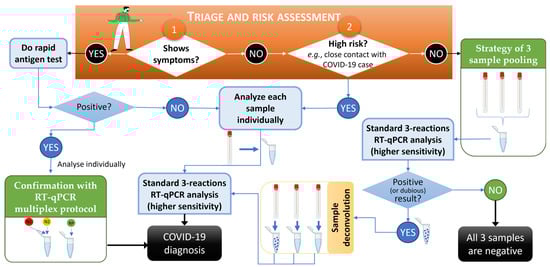 Workflow for COVID-19 mass screening using RT-qPCR-based diagnosis and relying on the developed strategies of low-risk sample pooling and multiplex analysis for predictably high-viral-load samples. In the orange box, numbers 1 and 2 represent the start of the procedure of triage and risk assessment of individuals. The pathways for Yes and No indicate the approach to be followed. Developed methodologies described in this work are in green boxes, and standard procedures are in light blue boxes. An RT-qPCR was considered dubious when at least one viral target was amplified and/or had Cp values above the standardized 35-cycle threshold. This workflow was created using BioRender.com and PowerPoint.