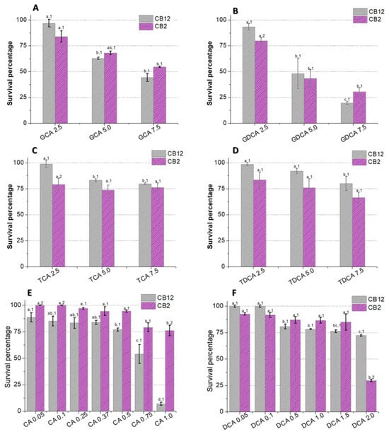 Survival of L. parabuchneri CB12 and L. plantarum CB2 strains in MRS medium with different concentrations of (A) GDCA (glycodeoxycholic acid), (B) GCA (glycocholic acid), (C) TDCA (taurodeoxycholic acid), (D) TCA (taurocholic acid), (E) DCA (deoxycholic acid), and (F) CA (cholic acid). To compare the effect of BAs on each strain and between strains, statistical analysis was carried out with the Minitab® 19.1 software program. For the multiple comparisons test, Fisher’s LSD test was performed with a confidence level of 95%. Identical letters for each treatment indicate no statistically significant differences from the control. Equal numbers indicate no significant differences between strains.