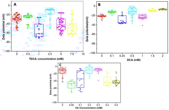 Zeta potential distribution of the L. parabuchneri CB12 strain as a function of BAs concentration: (A) TDCA (taurodeoxycholic acid); (B) DCA (deoxycholic acid); (C) CA (cholic acid). The box plot shows the zeta potential distribution for the different concentrations which are showed in different colors.