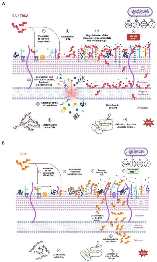 From the results obtained, it can be inferred that the three BAs evaluated produced changes in the net surface charge of the bacteria, with some differences among them. Figure 6 proposes a model with which to explain the interaction of the different BAs on the cell wall of a Gram-positive bacterium. At the beginning, the interaction occurs with different cell envelope components, such as peptidoglycan and lipoteichoic acid of the cell walls and phospholipids of the bacterial membrane, which is in agreement with results obtained via Raman microscopy. Once inside the cell, BAs denature intracellular proteins and nucleic acids. The decrease in ZP values observed at low concentrations of CA and TDCA can be explained as a phenomenon of incorporation and accumulation of BAs in the bacterial cell membrane (Figure 6A). It is important to note that TDCA was evaluated at higher concentrations than free BA. In this sense, in bifidobacteria, exposure to bile causes increased hydrophobicity and reduced ZP due to the accumulation of bile in the membranes [28]. On the other hand, DCA, at the concentrations tested, altered the ZP of the bacteria the least, with slight shifts towards more positive values (Figure 6B). This suggests that the compound diffuses rapidly into the cell compared to CA and TDCA. In this regard, Kurdi et al. (2006) [20] reported that due to its hydrophobicity, 10 times more DCA molecules can cross the membrane relative to CA in a given time. In the case of TDCA, the presence of the amino acid taurine provides increased hydrophilicity to the molecule. In addition, the TDCA molecule has a more negative surface potential and a higher dipole moment than DCA, according to studies by Bustos et al. (2022) [25] based on theoretical calculations. Moreover, at the pH of the tests (7.2), the weak acidic groups of both the cell wall polysaccharide and surface proteins may be dissociated, and exposure to BAs may denature the molecules and expose charged groups.