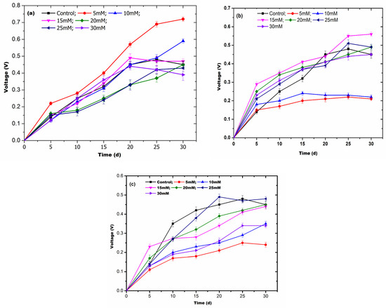 In the present study, three carbon-based conductive materials (activated graphite powder, activated charcoal powder, and biochar powder) were used to enhance the DIET-based AD of pine needles and V production. The addition of conducting materials had a conducive effect on V generation, and 5 mM graphite powder exhibited 0.71 V ± 0.013 V on the 30th day (Figure 3a), while 15 mM activated charcoal powder generated a maximum of 0.56 V ± 0.013 on the 25th day of AD (Figure 3b). Moreover, biochar powder exhibited a maximum of 0.49 V ± 0.011 on the 20th day of AD (Figure 3c) but was significantly low as compared to the control system (without pine needles). From the comparative analysis of all three conductive materials, graphite powder (5 mM) was found to be most suitable for the AD of the lignocellulosic substrate and the subsequent production of maximum current.