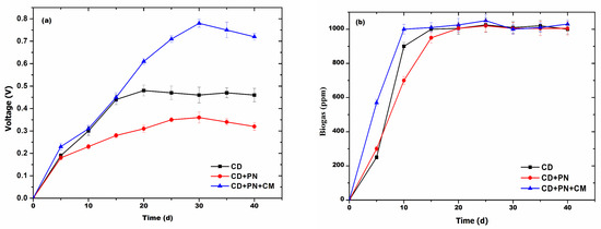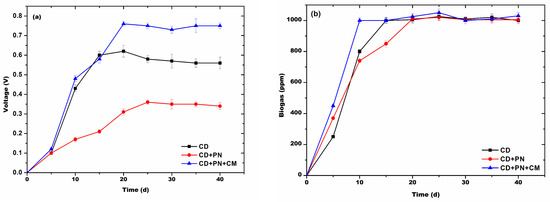 The effect of graphite powder (5 mM) on the batch AD process of pine needles and the generation of (a) voltage and (b) biogas.