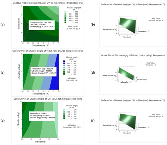 Three-dimensional surface plots and two-dimensional contour plots for the variety Kentichi ((a,b) temperature versus time; (c,d) temperature versus liquid-to-solid ratio; and (e,f) time versus liquid-to-solid ratio).