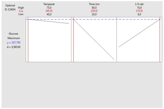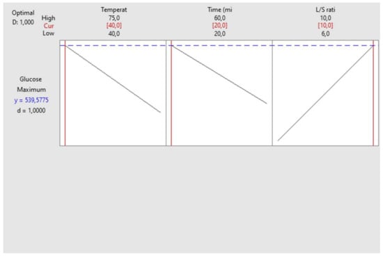To validate the proposed model, the extraction procedure was repeated in triplicate under the optimum conditions described above (40 °C, 20 min, 10 mL/g). The experimental value registered was 507.64 mg glucose/g DP, which is consistent with the predicted value given by the model (539.577 mg glucose eq/g DP), as shown in Figure 6. This result was obtained with a desirability of 100%.