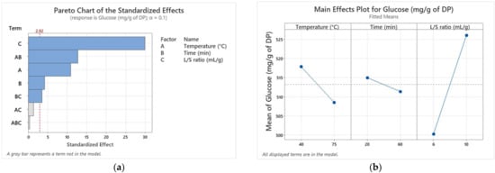 The FFD is a systematic approach used in research and experimentation to examine the effects of multiple factors, each at different levels, and understand their individual and combined effects on a particular response of interest. FFD provides a complete and detailed analysis of how each factor influences the response variable, enabling researchers to make informed decisions [24]. In this study, the effect of three independent variables—temperature, extraction time and L/S ratio, as well as their interactions—on the total sugar contents was investigated using a full factorial design as a DOE. ANOVA was carried out to check the significance of the proposed models and to determine the most significant factors.