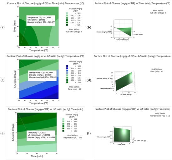 Three-dimensional surface plots and two-dimensional contour plots for the variety Alig. ((a,b) extraction temperature and time; (c,d) extraction temperature and liquid-to-solid ratio, and (e,f) extraction time and liquid-to-solid ratio).