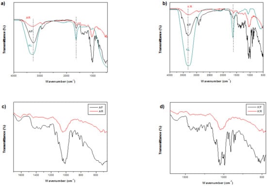 FT-IR spectra of Alig fruit (AF), Alig residue (AR), and Alig liquid extract (AL) (a,b), as well as Kentichi fruit (KF), Kentichi residue (KR), and Kentichi liquid extract (KL) (c,d).