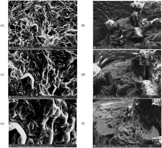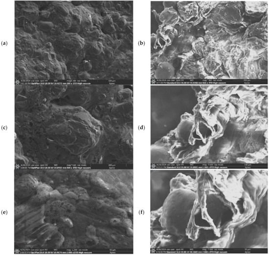 The surface morphology of Alig fruit (AF), Kentichi fruit (KF), Alig residue (AR), and Kentichi residue (KR) was assessed using SEM and is displayed in Figure 8 and Figure 9. The untreated date samples (AF, KF) showed firm and compact surfaces (Figure 8a,c,e and Figure 9a,c,e). However, much damage was recorded with the treated ones (AR, KR) using different magnifications. As shown in Figure 8b,d,f and Figure 9b,d,f, many holes and cracks with sharp edges were generated on the surfaces of both varieties of date. These surface changes are explained by the strong effect of the acoustic cavitation generated by the ultrasonic wave, which attacked the cell walls and released the internal content [40]. In fact, the ultrasound waves navigated through the liquid solvent while producing acoustic cavitation, which caused particle fragmentation, cell disruption, and sonoporation. Therefore, the permeability of cell walls was improved, and the extraction yield was boosted [41]. Our results were in agreement with those provided by Santos et al. [42] and Dias et al. [43], who showed that the use of ultrasound waves for vegetal materials improved the extraction yield due to the lateral cracks formed, which led to the release of internal particles.