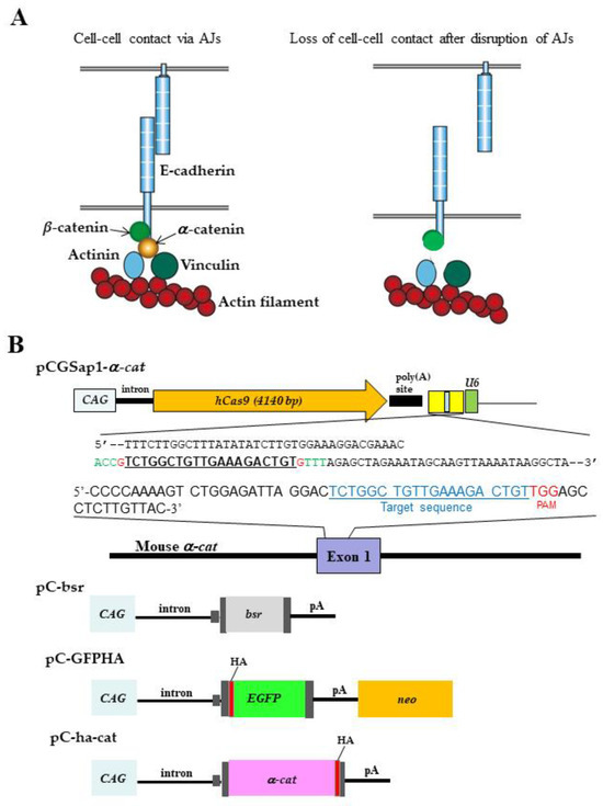 For the CRISPR/Cas9-mediated KO of genes, we used the pCGSapI vector developed by Takayuki Sakurai (Shinshu University, Nagano, Japan; [21]). This vector contains the human Cas9 gene under the control of the chicken β-actin promoter-based CAG promoter and a unique cloning site, Sap I, for inserting the guide RNA (gRNA) under the control of the U6 promoter. All synthetic oligonucleotides corresponding to the gRNA and its complementary strand contained the adaptor sequence of Sap I. The following oligonucleotides were used to construct gRNAs (lowercase letters represent adaptor sequences): 5′-accgTCTGGCTGTTGAAAGACTGTg-3′ and 5′-aaacACAGTCTTTCAACAGCCAGACc-3′. The sequence, recognized by the gRNA, is known to be effective for the KO of α-cat, having been previously targeted in dogs and humans [21,22]. The oligonucleotides were inserted into the Sap I site of pCGSapI to create pCGSapI-α-cat (Figure 1B). The fidelity of the resultant pCGSapI-α-cat was confirmed by DNA sequencing using the primer upstream of the Sap I site.