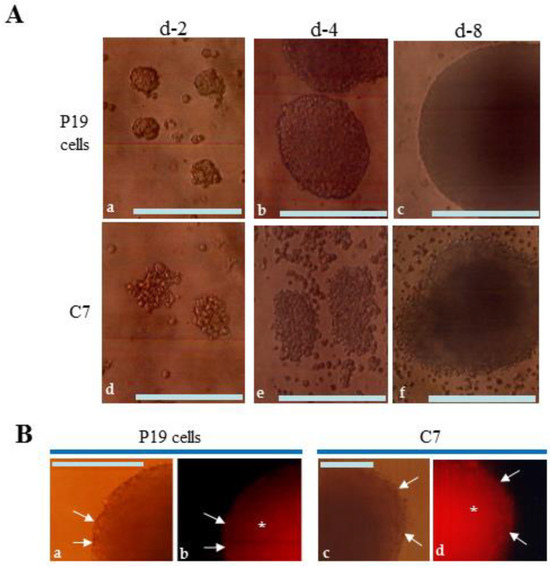 Next, we attempted to cultivate C7 cells under similar suspension conditions as used for P19 cells. While C7 cells formed aggregates, the surface of these aggregates was irregular, unlike that observed with P19 cells (Figure 3A(d–f)). Additionally, these structures were fragile, as vigorous pipetting easily and rapidly dissociated them into single cells. Immunostaining of C7 EBs cultured for 8 days with anti-SSEA-1 showed positive staining in both outer and internal cells (arrows and asterisks in Figure 3B(c,d)).