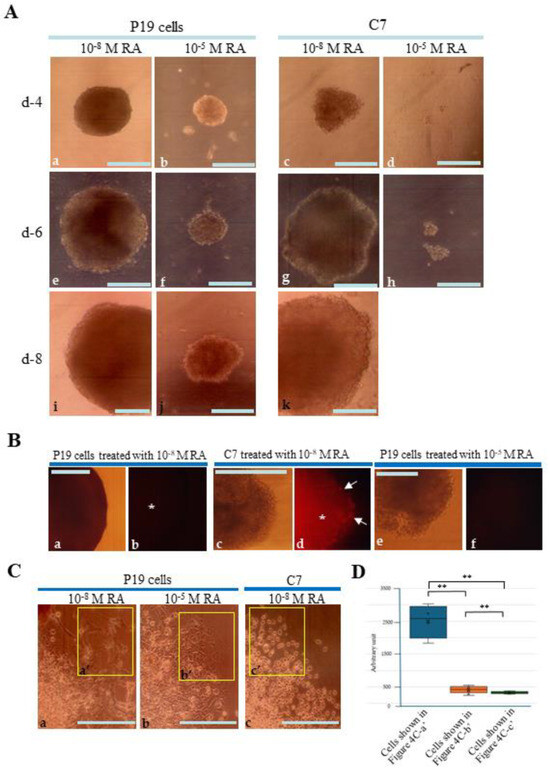 These findings were further validated by observing cells spreading from the EBs after their attachment to an adhesive substrate, confirming that the cells at the colony edge were derived from cells localized at the outer surface layer of the EBs. Outgrowth of P19 EBs four days after attachment of EBs (grown for eight days in the presence of 10−8 M RA or 10−5 M RA) allowed us to generate flat or epithelial-like cells that did not resemble the parental P19 cells (Figure 4C(a’,b’)). In contrast, C7 EBs (treated with 10−8 M RA) generated round cells, similar to C7 cells (Figure 4C(c’)). Quantitative analysis of the cells at the edge of the colony confirmed that the morphology of differentiated cells in each group was significantly different from each other (Figure 4D).
