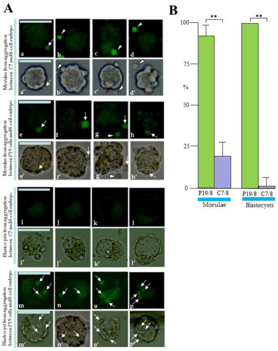 On the 1st day after aggregation, almost all the morulae generated after aggregation with intact P19 cells had one or more P19 cells on their surfaces or internal areas (arrows in Figure 6A(e–h,e’–h’)). When the number of morulae with one or more intact P19 cells was calculated and plotted on the graph, their percentage reached 92% (11/12 tested) (“P19/8” in Figure 6B). In contrast, almost all C7 failed to adhere to the surface of the ZP-removed embryos (arrowheads in Figure 6A(b–d,b’–d’)), and only a few embryos were found to have cells attached to the embryo surface (arrow in Figure 6A(a,a’)), but there were no embryos with it in its internal area (Figure 6A(a–d,a’–d’)). The percentage of embryos with one or more intact P19 cells was below 20% (2/11 tested) (“C7/8” in Figure 6B). On the 2nd day after aggregation, there was no embryo retaining C7 in its surface or internal area (Figure 6A(i–l,i’–l’); “C7/8” in Figure 6B), while all embryos retained one or more P19 cells in their surface or inside an embryo (Figure 6A(m–p,m’–p’); “P19/8” in Figure 6B).