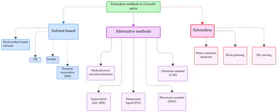C. sativa is considered an excellent source of bioactive compounds (cannabinoids, terpenes, flavonoids, and lignans) that can be extracted through diverse techniques [38]. Extraction methods can be classified into three broad groups. Traditional methods are based on the use of solvents (such as Soxhlet and maceration), alternative methods [38], and conventional methods without the use of solvents [39]. The main extraction methods used for Cannabis sativa are depicted in Figure 1. Solvent-based extractions can be subclassified into those using alcohols (methanol and ethanol), hexane, and ethers [40,41]. In this type of extraction, the solid material crushed in the organic solvent is disposed of in different proportions, filtered, and stored. In extractions using ether, organic acids are used to adjust the pH [42], and continuous evaporation–condensation cycles can be used to improve efficiency [43] or dynamic maceration, which is more efficient [44]. In addition, there are other methods for making oil extractions in which the use of edible vegetable oils as a solvent is required, such as coconut [45], sunflower [46], and olive [47]. For example, Cannabis flowers are dried between 85 and 145 °C for 40 min in a convection oven, pulverized, coated with olive oil (1:10), stirred for 40 to 120 min, filtered, and stored [47]. Although widely used, this type of extraction is inefficient and, in some cases, can leave potentially toxic residues [48].