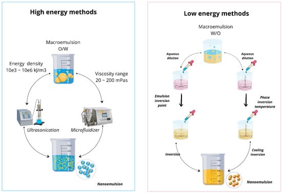 The synthesis of nanoemulsions is not the last step of the process; stability is one of the most critical points, as the particle size, the zeta potential, the surfactant, and the composition of the dispersing phase condition it. Cremation, sedimentation, coalescence, and Ostwald maturation are consequences of a loss of stability and bioactive compounds [75]. If large nanoemulsion droplets lead to sedimentation/cremation, an unfavorable zeta potential leads to aggregation and a marked difference in droplet sizes. Aspects such as viscosity can affect how the emulsion can be applied or dosed in experimental animal models [54]. To state the above in physicochemical terms, at a biological level, nanoemulsions could present little assimilation if the components used are not related to the cells of the target tissue. The stability and viscosity of nanoemulsions should be explored with new surfactants that reduce the interfacial tensions of the phases without significantly increasing the nanoemulsion’s size or the continuous phase’s rheological properties. Sedimentation, on the other hand, the surface modification of the particles, could improve electrostatic repulsion and prevent the aggregation of droplets. However, it must be ensured that this functionalization does not alter the mechanism of action of the nanoemulsion [76]. Furthermore, the synthesis method significantly influenced nanoemulsion properties. In this context, high- and low-energy methods have been used to synthesize nanoemulsions (Figure 3), as described below.
