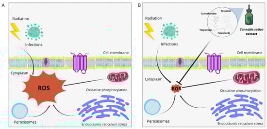 Antioxidant properties. ROS: reactive oxygen species. (A) Cell with a large amount of ROS produced by different factors. (B) The administration of EC is rich in antioxidant compounds capable of reducing reactive oxygen species [97].