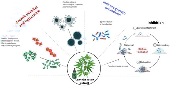 Among the therapeutic interests aroused by C. sativa are its antimicrobial properties. The improved distribution of nanoemulsions shows promise in encapsulated extracts in dose reduction for effective microbial activity, although few studies have been published. For example, extracts of different varieties of C. sativa had variable antimicrobial effects depending on their chemical composition and the concentration used on the microbial strains. The most significant inhibition of growth by C. sativa extracts was against Bacillus thuringiensis, Staphylococcus aureus, Candida albicans, Micrococcus luteus, Pseudomosas protegens, Saccharomyces cerevisiae, and Fusarium eumartii [92]. In another study, C. sativa seed extract inhibited the growth of pathogenic Enterobacteriaceae and the formation of Staphylococcus aureus biofilms without detecting an antimicrobial effect on probiotic bacteria of the genus Bifidobacterium and Lactobacillus [98].