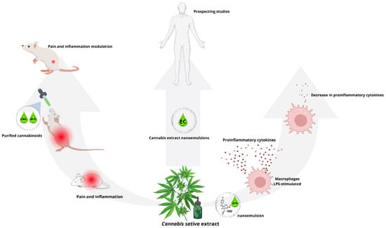 Another aspect of the therapeutic properties of C. sativa to consider is immunomodulation [103,104,105]; see Figure 6. One of the aspects to highlight is that pure extracts of C. sativa have possibly been little studied due to the presence of THC and its known psychotropic effect [106]. There are relatively few studies that include cannabinoid mixtures. Blanton and collaborators [107] reported that the CBD–BCP interaction modulated pain and inflammation in a murine model. In another study, indomethacin (IND) nanoemulsions were prepared with BCP (BCP–IND) in different proportions to test the anti-inflammatory effect in LPS-stimulated macrophages. The results of the trials showed that BCP–IND nanoemulsions reduced the production of pro-inflammatory cytokines more than only BCP or IND. This indicates that cannabinoids alone have therapeutic potential. Still, in conjunction with other cannabinoids or other drugs, they can be even more effective, suggesting the use of pure C. sativa extracts in O/W nanoemulsions. In research focused on the treatment of diabetes mellitus (DM), a condition characterized by high oxidative stress and alteration of the immune system [88], Wistar rats with C. sativa oil-induced DM (CSO) and nanoemulsions of C. sativa oil (NECSO) and metformin were used. The trials demonstrated that CSO and NECSO positively affected DM symptoms and reduced glucose in urine, blood, triglycerides, and low-density lipoproteins (LDL) [108]. A graphic summary of this section is presented in Figure 6.