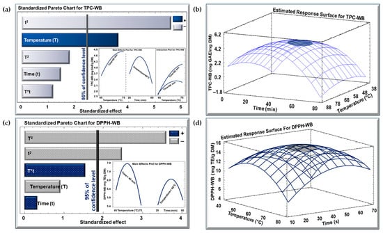 Standardized Pareto chart with insert for the effect of temperature and time for (a) TPC and (c) DPPH concentration for WB method, and estimated response surface for (b) TPC and (d) DPPH concentration. (+) denotes a positive effect, and (−) denotes a negative effect.
