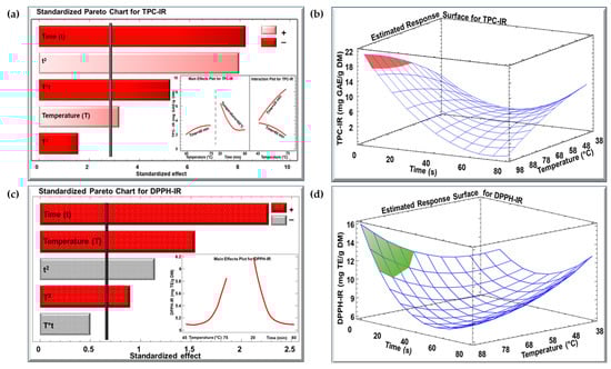 Standardized Pareto chart with insert for the effect of temperature and time for (a) TPC and (c) DPPH concentration for IR technique, and estimated response surface for (b) TPC and (d) DPPH concentration. (+) denotes a positive effect, and (−) denotes a negative effect.