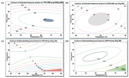 Contours of the estimated response surface for (a) TPC-WB, (b) DPPH-WB, (c) TPC-IR, and (d) DPPH-IR in the function of time and temperature for KPEs. The colored zone indicates the optimum conditions to attain the highest TPC and DPPH concentration.