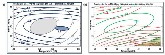 Figure 4 displays the overlay plot for the TPC and DPPH for the WB and IR extraction methods. In Figure 4a, the iso-response curves of TPC-WB (blue) and DPPH-WB (grey) are shown concurrently. The optimal extraction parameters for achieving the highest TPC (4.8 mg GAE/g DM) and DPPH concentration (14.8 mg TE/g DM) using the WB method can be selected from the overlapping region of the two zones, which corresponds to 70 °C for 35 min. In Figure 4b, the red and green zones represent the optimal extraction parameters for the IR method. As these zones overlap, the extraction parameters can be selected at 90 °C for 5 min to obtain a TPC value of 21 mg GAE/g DM and a DPPH concentration of 16 mg TE/g DM.