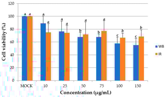 The anti-tumor activity on A549 cells was observed for WB and IR KPEs, obtained under optimal conditions (70 °C for 35 min for WB and 90 °C for 5 min for IR), at different concentrations, as shown in Figure 5. The WB KPE effectively reduced A549 cell viability at 50 µg/mL by 28.34% and by 44.7% at 150 µg/mL. The IR KPE was effective in significantly reducing A549 cell viability to 42% at 100 µg/mL with no further significant reduction at 150 µg/mL.