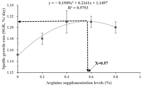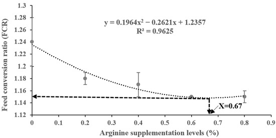 Table 4 shows the growth performance results. The FBW and WGR values all showed an increasing trend up to the 0.4% Arg supplementation group, followed by a declining trend; the effects of the Arg supplementation levels were not statistically different (p > 0.05). The SGR was markedly higher in the 0.4% and 0.6% Arg supplementation groups than in the 0% (control) group (p < 0.05), and the FCR was significantly lower in the 0.6% and 0.8% Arg supplementation groups than in the 0% (control) group (p < 0.05). We compared the R2 of the SGR and FCR quadratic, linear, and broken linear regression models (SGR: quadratic regression R2 = 0.9793 > linear regression R2 = 0.6499 > broken linear regression R2 = 0.487; FCR: quadratic regression R2 = 0.9625 > linear regression R2 = 0.8047 > broken linear regression R2 = 0.497). Hence, we chose quadratic regression models based on the highest value of R2; quadratic regression analyses yielded optimal Arg supplementation levels for juvenile Gibel carp for SGR and FCR, which were 0.57% and 0.67% in the dry diet, respectively (Figure 1 and Figure 2). Table 5 shows that the whole-body water, fat, ash, and protein contents were not significantly affected by the feed treatments in this study (p > 0.05).