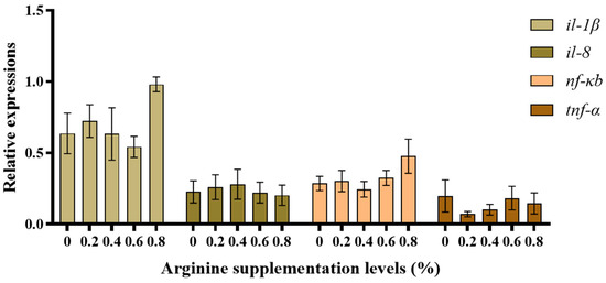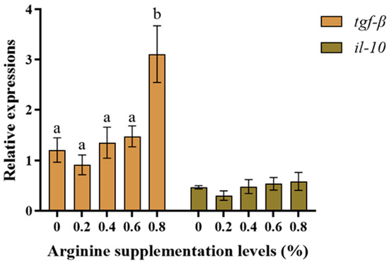 In the past few years, Arg-mediated immunomodulation has attracted particular interest [65,66,67]. Arg has multiple functions, including participation in protein synthesis, urea production, polyamine synthesis, proline and guanidinium synthesis, and the endocrine and reproductive regulatory processes. Therefore, its involvement in the immune response of fish may be crucial for managing their health throughout the feeding cycle. This is a key reason why Arg supplementation is considered a strategy for improving immune responses [68,69]. For example, in turbot, Arg supplementation improved the immunosuppressive response because of high stocking density [70]. In addition, studies on mirror carp (Cyprinus carpio) have shown that dietary Arg supplementation upregulates anti-inflammatory genes in the gut [62]. Our results showed il-1β expression in the liver was highest in the liver at 0.8% Arg level, in line with Chen et al. [71] and Hoseini et al. [72], who found upregulated il-1β and tnf-α levels in the heads and kidneys of carp after Arg supplementation. Under normal conditions, this effect on pro-inflammatory cytokines could be interpreted as enhancing the immune response, preparing fish to face pathogens. Supporting this hypothesis, Chen et al. proposed that Arg enhances the immune response and increases resistance to Aeromonas hydrophila in Jian carp by upregulating the expression of pro-inflammatory genes [71]. That study’s findings show that 0.8% Arg supplementation significantly upregulated the relative expression of tgf-β, suggesting that appropriate Arg levels may attenuate tissue inflammation and reconcile body homeostasis by increasing the gene expression of anti-inflammatory factors such as tgf-β. Taken together with our results, this might indicate that Arg supplementation improves growth and immune responses.