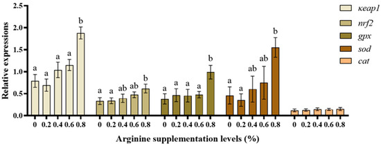 Figure 5 shows the antioxidant-related gene results. The nrf2 mRNA expression was significantly higher in the 0.8% Arg supplementation group than in the 0% (control) group (p < 0.05). The κeap1 mRNA expression was significantly higher in the 0.8% Arg supplementation group than in the 0% (control) group (p < 0.05). The sod and gpx mRNA expression was highest in the 0.8% Arg supplementation group (p < 0.05). There was no difference between the groups in cat mRNA expression, which showed the same trend (p > 0.05).