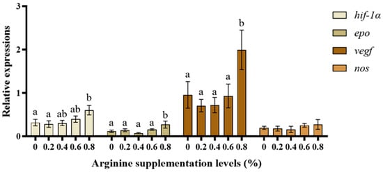 Figure 6 shows gene expression results related to the HIF-1 pathway. The hif-1α, epo, and vegf mRNA expression in the 0.8% Arg supplementation group were markedly higher than in the 0% (control) group (p < 0.05). There was no significant difference in nos mRNA expression between the groups (p > 0.05).