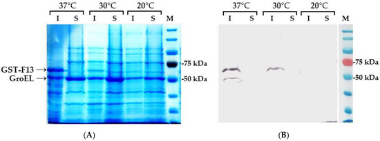 E. coli BL21 (DE3) cells were heat-shock transformed with the pET21-GST-F13 plasmid, and the transformants were plated on selective LB-agar medium containing ampicillin (100 µg/mL). For co-transformation with pET21-GST-F13 and a chaperone-carrying plasmid (pGroM, pTF, or pGTi), LB-agar was supplemented with a mix of ampicillin (100 µg/mL) and kanamycin (50 µg/mL) for double transformants.