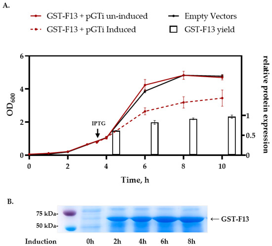 The production of GST-F13 in 500 mL flasks containing 150 mL of LB medium took place, with an inoculation dose of 1/100 of the total volume. To bring tighter control over gene expression, 0.4% glucose was added. Induction occurred at an optical density of 0.8–0.9 (OD600) at 37 °C, with shaking at 200 rpm.