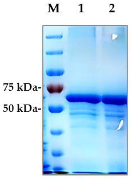An SDS-PAGE analysis of proteins was conducted under denaturing conditions following Laemmli’s method, utilizing 8% polyacrylamide gels. After electrophoresis, the gels were stained with Coomassie Brilliant Blue G-250 to visualize the separated proteins.