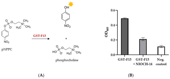 The measurement of the phospholipase C activity of F13-GST was carried out by hydrolyzing p-Nitrophenylphosphorylcholine (p-NPPC) (Sigma-Aldrich, St. Louis, MO, USA).