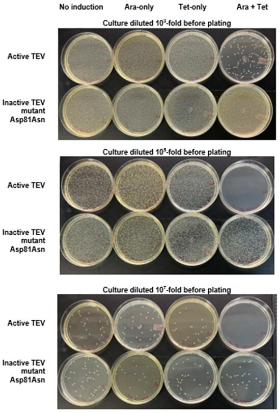 Assays testing the functionality of the designed system were performed under many different conditions, and the main results are summarized in the following sections. For these cell survival assays, E. coli TOP10 competent cells were transformed with either the TEVpro vector or TEVproi vector. Anhydrotetracycline addition induced the expression of the selective TEV substrate ccdB-ENLYFQG-ssrA, and arabinose induced the expression of either the active TEV protease (TEVpro) or TEV Asp81Asn mutant, which lacks enzymatic activity (TEVproi). It is noteworthy that active TEVpro also contains the S219V mutation (Figure S2), which prevents the auto-degradation of TEV protease, thus improving the stability of this enzyme [22].