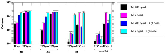 Cell survival assay with the selective substrate ccdB-ENLYFQG-ssrA expressed under the control of the Tet promoter and TEVpro (or TEVproi) under the control of the Ara promoter. The photographs show typical results of culture plating of E. coli TOP10 transformed with the TEVpro vector (upper plates at each level of dilution) or TEVproi (lower plates at each level of dilution), after the following treatments (as described Section 2.4): no induction (N.I.); induction with only arabinose (Ara); induction with only anhydrotetracycline (Tet); induction with both anhydrotetracycline and arabinose (Tet + Ara). The photos show plates from one of the assay triplicates (condition: Tet 2 ng/mL with glucose), whose comparative quantification with other assay conditions if represented in Figure 3 by the cyan bars.