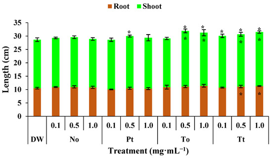 In control bean plants, the root, shoot, and total plant lengths were 10.5 cm, 18.1 cm, and 28.6 cm, respectively (Figure 2). Under these conditions, hydroalcoholic extract of P. tricornutum increased the total length of plants by 4% at 0.5 mg·mL−1. The extract of T. obliquus increased the length of shoots and entire bean plants by 11% at both 0.5 and 1.0 mg·mL−1. Finally, the extract of T. tetrathele increased the length of entire bean plants by 7% at all tested concentrations and the length of shoots and roots by 6%.