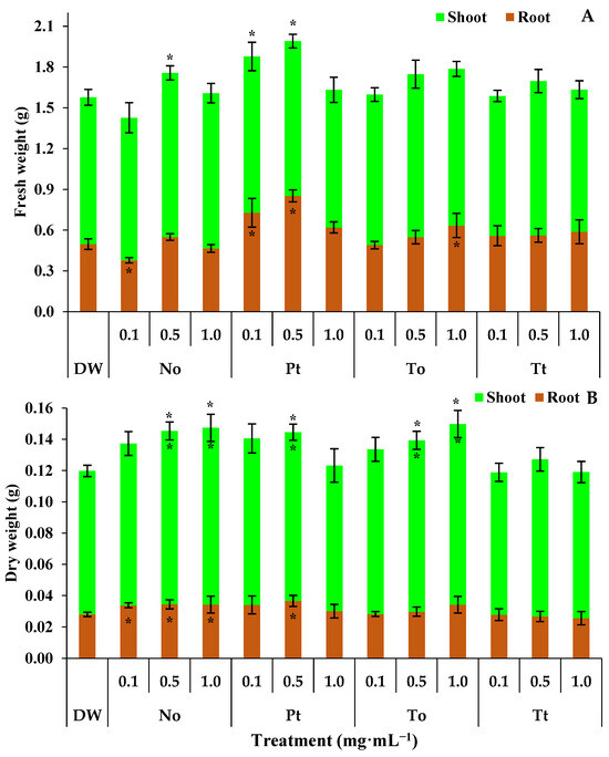 Root, shoot, and total fresh weight (A) and dry weight (B) (g) of bean plants (Phaseolus vulgaris) drenched four times with varying concentrations of hydroalcoholic extracts Nannochloropsis oculata (No), Phaeodactylum tricornutum (Pt), Tetradesmus obliquus (To), or Tetraselmis tetrathele (Tt). The plants were cultivated in a growth chamber under controlled conditions: 21 ± 2 °C temperature, 12 h photoperiod, and 80% relative humidity, for 11 days post sowing. * Within the columns indicate significant differences between treatments and the control for root or shoot fresh/dry weight, while outside the columns indicate differences for total fresh/dry (root + shoot) according to Tukey Test (p ≤ 0.05, n = 4). Error bars represent standard deviation of means.