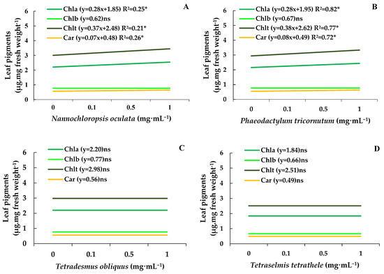 Chlorophylls a and b content, total chlorophyll, and carotenoid levels (µg·mg of fresh mass−1) in leaves of bean plants (Phaseolus vulgaris) drenched with varying concentrations of the microalgae Nannochloropsis oculata (A), Phaeodactylum tricornutum (B), Tetradesmus obliquus (C), or Tetraselmis tetrathele (D). Plants were kept in a growth chamber at 21 ± 2 °C, with a 12 h photoperiod and 80% relative humidity, for 11 days after sowing. Equations marked with * indicate significant regression, while ‘ns’ means non-significant based on the F test (p ≤ 0.05; n = 4).