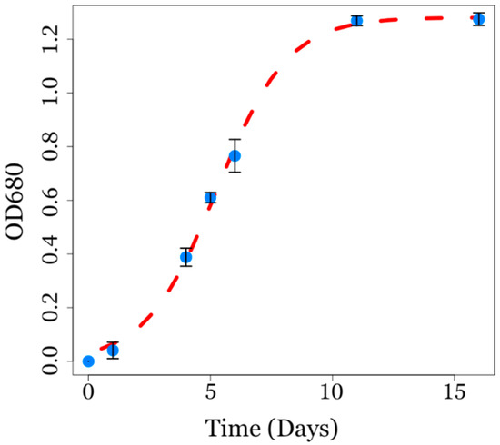 Growth curve of Chlorella sorokiniana cultivated in an aerated batch culture in a 5 L bottle. Values are means ± SD, n = 3. The blue markers indicate the mean OD680 values at different time points, while the error bars represent the corresponding standard deviations. The red dashed line represents the fitted exponential growth model.
