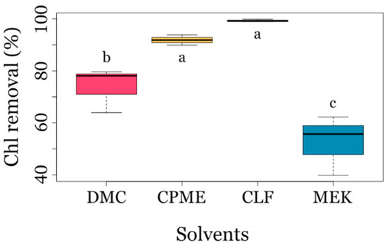 The boxplot illustrates the yields of chlorophyl removal after pre-treatment with sodium hydroxide, obtained with green organic solvents dimethyl carbonate (DMC), methoxycyclopentane (CPME), and butan-2-one (MEK) and non-green reference solvent chloroform (CLF). Following treatment, a diluted extract aliquot was employed to record UV-Vis spectra. Different letters (a, b, c) indicate statistically significant differences according to Duncan’s test.